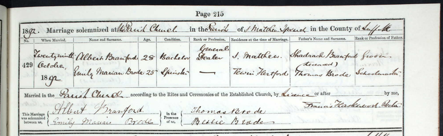 I’m surprised Albert didn’t also marry at Great Bricett. All six siblings were baptised there, their parents (and Aunt Mary) were buried there, and all the siblings were married there, except Albert. His bride, Emily Marian Brode, was from Hertfordshire, but the previous year was recorded in the 1891 census, at the School House in Ringshall, as a ‘National Governess’. Albert’s residence was given as St Matthew (Ipswich) on the marriage record but we don’t know how long he was resident there – a week? a year? He had been recorded in Bricett the previous year as an agricultural labourer, but was now a general dealer.
