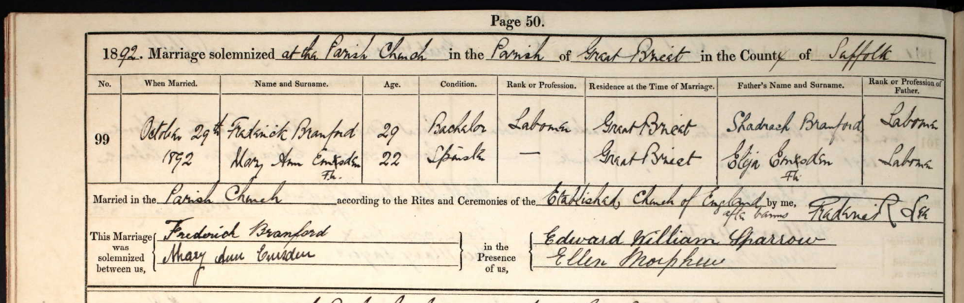 On the same day, in the same church, her elder brother, Frederick Bramford, married Mary Ann Emsden.