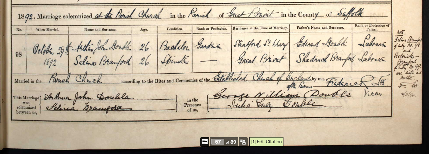 On 29 October 1892, Selina Bramford and Arthur John Double married in the parish church of Great Bricett, Suffolk.