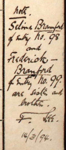 note. Selina Bramford of Entry no. 98 and Frederick Bramford of Entry no. 99 are sister and brother. F. Lee. 14/3/94.