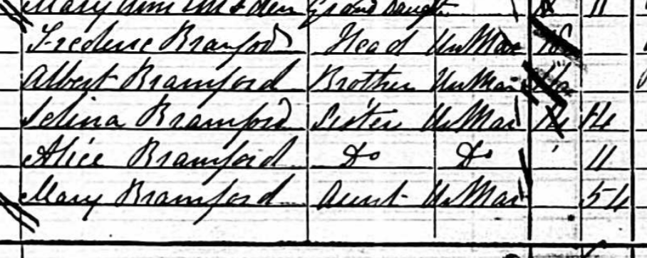The three Bramfords were three of six siblings all born in Great Bricett – Ellen, Maria, Frederick, Albert, Selina, and Alice. Their mother died in 1878, just over a year before the eldest sibling, Ellen, married in 1880. Less than two months later, their father died. In 1881, the rest of the siblings (except one) were recorded at Great Bricett with their Aunt Mary. Frederick (18) was listed as the head of household, but their aunt had presumably stepped up to care for her brother’s orphaned children and keep house for them.